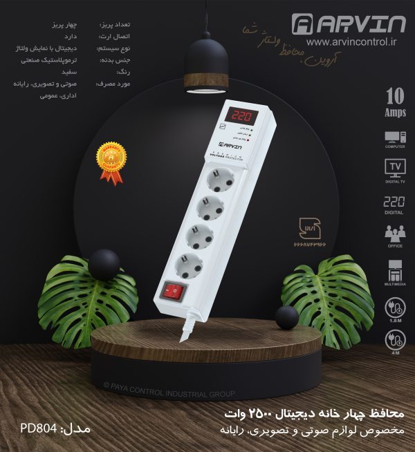 محافظ برق چهار خانه 2500 وات دیجیتال آروین ارت دار با کابل 4 متر مدل PD804