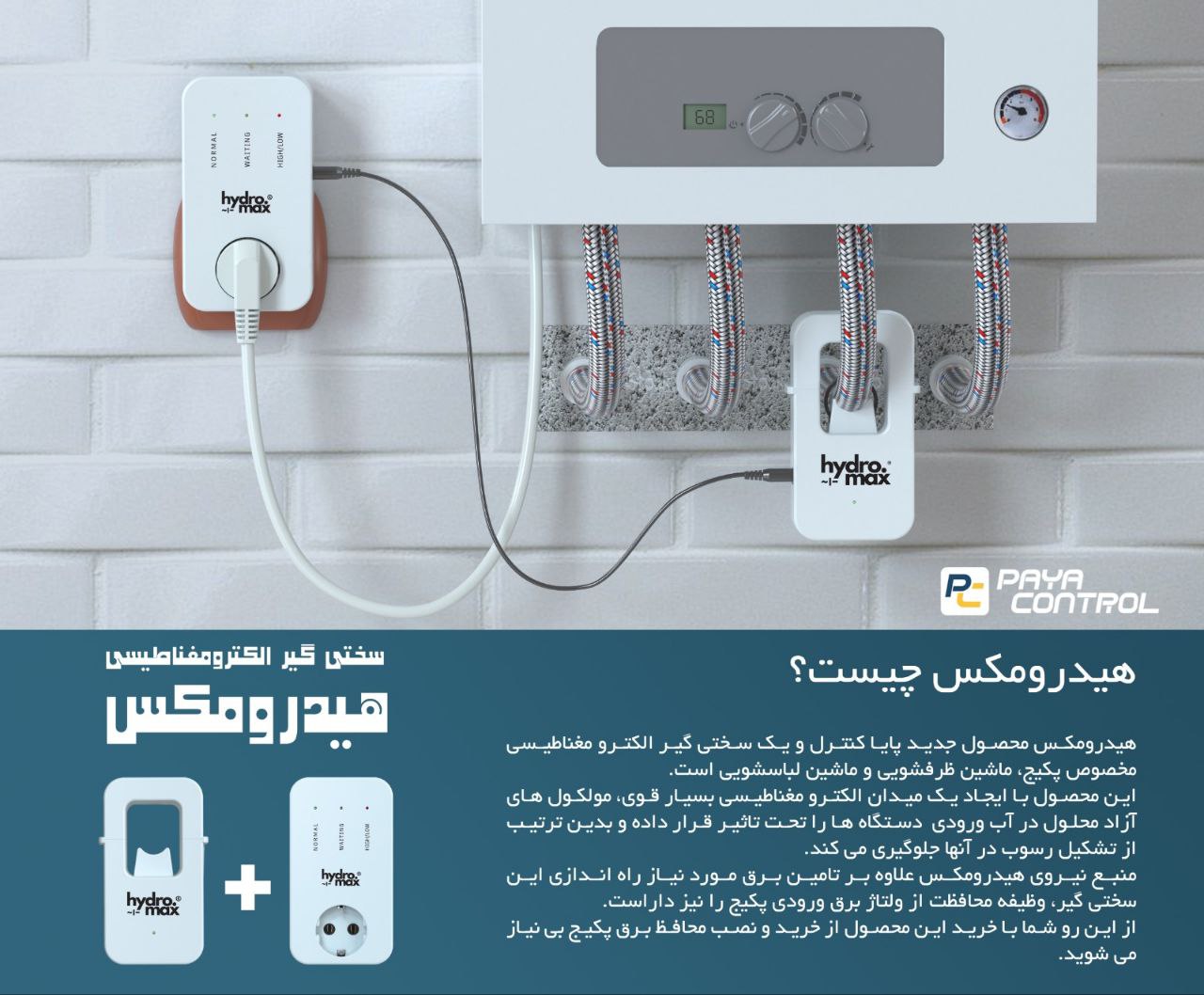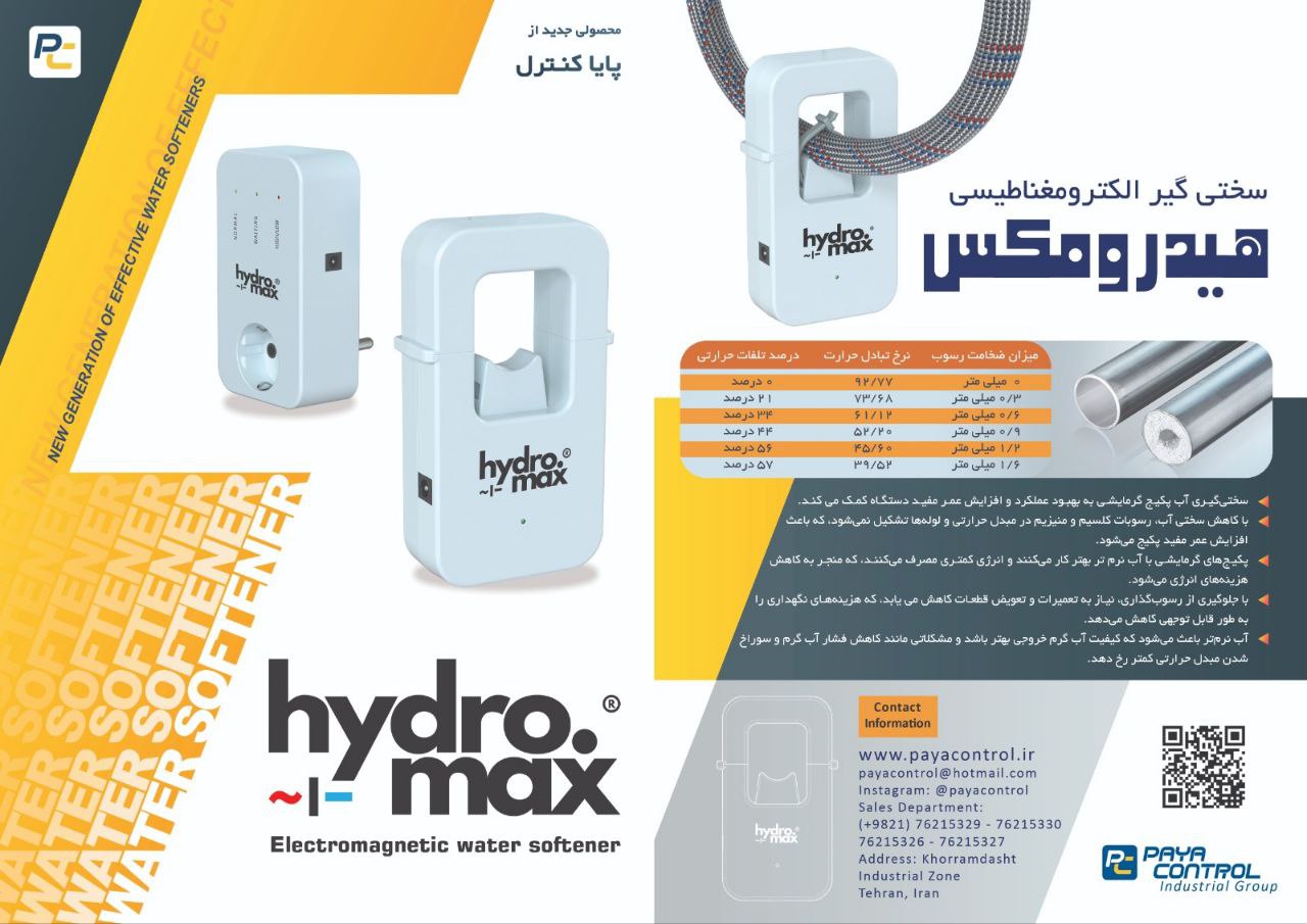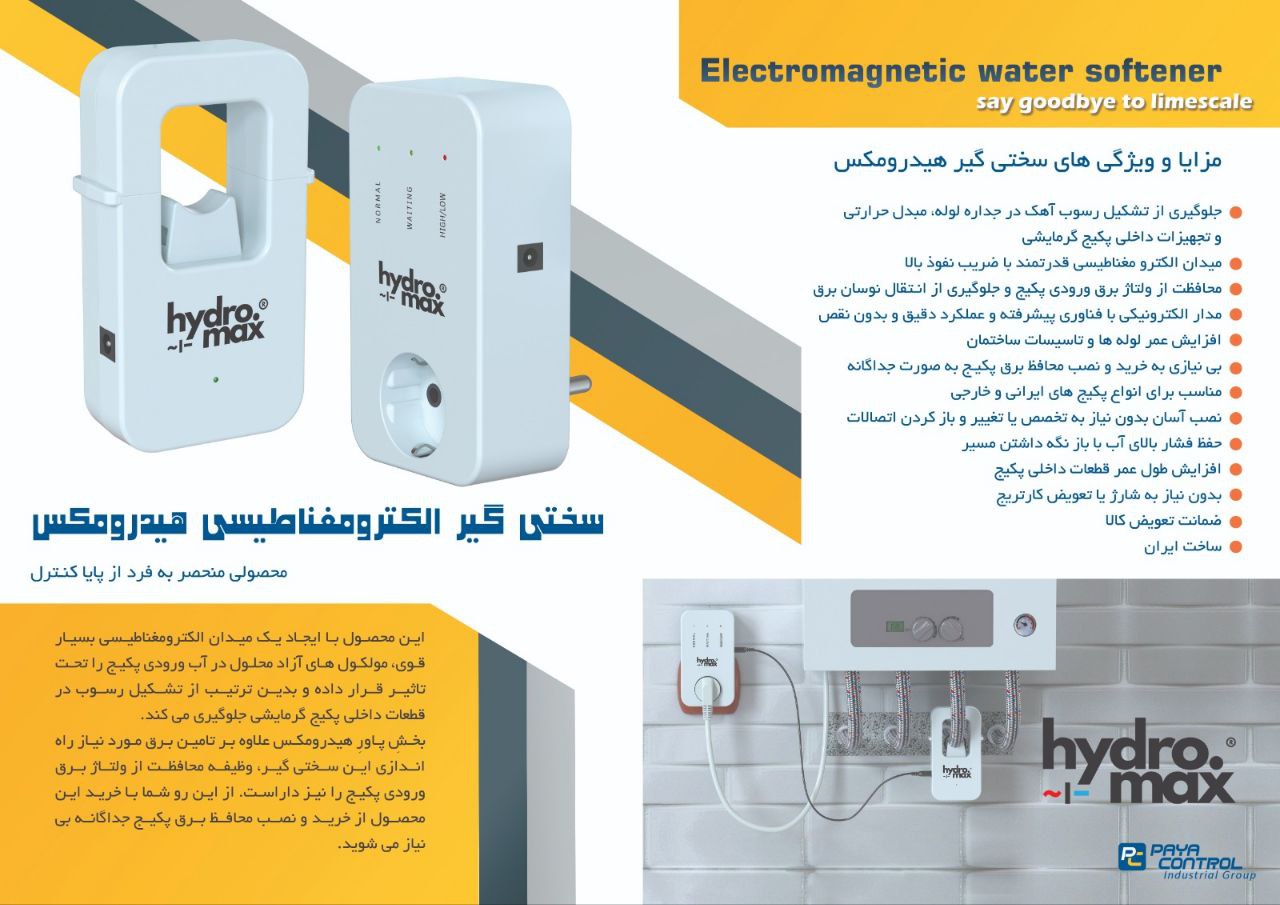 هیدرومکس محصول جدید پایا کنترل و یک سختی گیر الکترو مغناطیسی مخصوص پکیج، ماشین ظرفشویی و ماشین لباسشویی است. این محصول با ایجاد یک میدان مغناطیسی بسیار قوی، مولکول های آزاد محلول در آب ورودی این دستگاه ها را تحت تاثیر قرار داده و بدین ترتیب از تشکیل رسوب در آنها جلوگیری می کند. منبع نیروی هیدرومکس علاوه بر تامین برق مورد نیاز راه اندازی این سختی گیر، وظیفه محافظت از ولتاژ برق ورودی پکیج را نیز داراست. از این رو شما با خرید این محصول از خرید و نصب محافظ برق پکیج بی نیاز می شوید. با سختی گیر اولتراسونیک هیدرومکس همراه با محافظ برق پکیج هیدرومکس، به کارکرد بیوقفه و بهینه سیستم حرارتی خود اطمینان دهید. این محصول با تکنولوژی پیشرفته اولتراسونیک، به طور موثر از تشکیل رسوب جلوگیری کرده و با محافظ برق هوشمند، دستگاههای شما را در برابر نوسانات برقی محافظت میکند. یک انتخاب هوشمندانه برای حفظ عمر مفید تجهیزات شما!