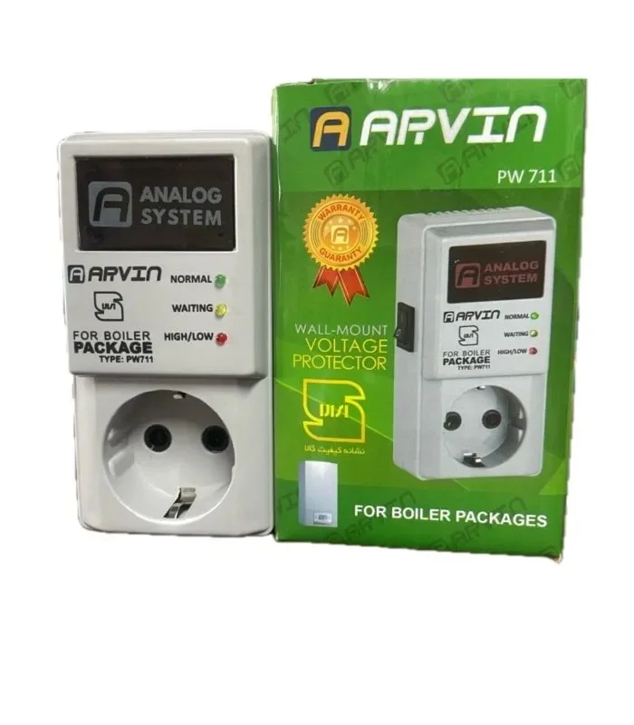 محافظ تک خانه پکیج آنالوگ آروین مدل PW711 نوعی محافظ ولتاژ است که برای حفاظت از پکیج های گرمایشی دیواری طراحی شده است. این محافظ ولتاژ وظیفه دارد تا نوسانات ولتاژ شبکه برق را تحت کنترل نگه داشته و از آسیب رسیدن به پمپ، موتور فن، برد الکترونیکی و سایر اجزای پکیج جلوگیری کند. محصولی با ضریب اطمینان بسیار بالا و از طول عمر مفیدی برخوردار میباشد. این محافظ دارای پریز استاندارد ارت دار می باشد.